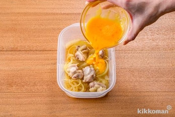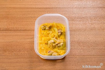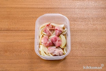 耐熱容器に玉ねぎ、鶏肉、(A)を入れて軽く混ぜ、ふんわりとラップをかけて電子レンジ(600W)で2分30秒~3分、鶏肉に火が通るまで加熱する。