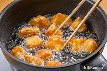 フライパンに揚げ油を深さ1cmほど入れて170℃に熱し、(2)を入れてときどき転がしながら5分ほど揚げる。