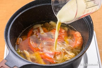 えびは殻つきのまま背に切り込みを入れ、背わたを取り除く。しめじは小房に分ける。玉ねぎは繊維に沿って薄切りにする。パプリカはへたと種を取って、縦に5mm幅に切る。