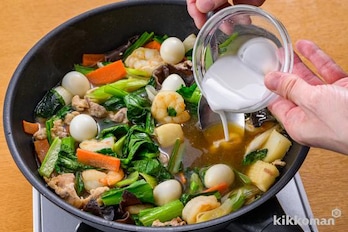 水300ml、(A)、うずら卵を加えて、2分ほど煮て火を通す。(B)の水溶き片栗粉をよく混ぜてから加え、とろみをつける。塩、こしょう各少々で味を調え、火を止めてごま油を回し入れる。