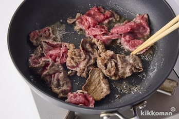 フライパンにバターを入れて中火で熱し、溶けて泡立ってきたら牛肉を入れて広げ、さっと焼いて取り出す(牛肉は火を通し過ぎるとかたくなるので、ここでは完全に火を通さなくてOK)。