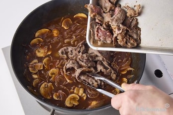 ふたを取って中火にし、1~2分煮詰める。(2)の牛肉を戻し入れ、肉の色が完全に変わるまで煮る。味を見て薄ければ、しょうゆ少々(分量外)で味を調える。器にご飯とともに盛る。