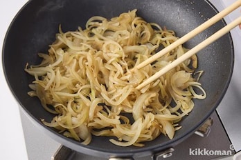 同じフライパンに玉ねぎ、にんにくを入れ、少し色づくまで中火で5分ほど炒める。