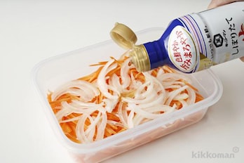 にんじんは皮をむいて、斜め薄切りにしてからせん切りにする。玉ねぎは薄切りにする。