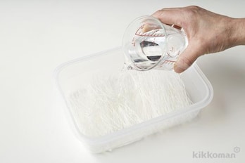 密閉できる耐熱性の保存容器に春雨を入れ、水1カップをかける。軽くふたをして、電子レンジ(600W)で5分加熱する。