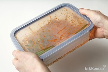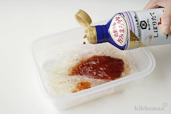 保存容器の水を捨て、春雨をキッチンばさみで食べやすい長さに切る。(A)を加える。