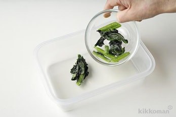 密閉できる耐熱性の保存容器に冷凍ほうれん草を凍ったまま入れる。軽くふたをして、電子レンジ(600W)で1分加熱し、水けをきる。