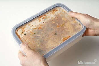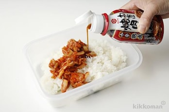 (1)の保存容器にご飯、キムチ、焼肉のたれを加える。