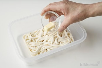 密閉できる耐熱性の保存容器に冷凍うどん、バターを入れ、軽くふたをして、表示の通りにレンジ加熱をする。