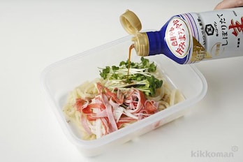 貝割れ菜、かに風味かまぼこ、(A)を加える。