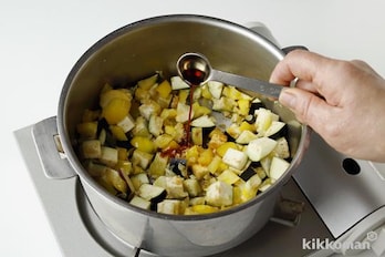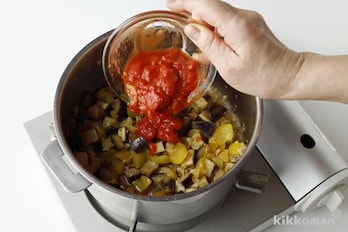カットトマト、しょうゆ小さじ1を加え、ときどき混ぜながら2分ほど煮る。【しょうゆポイント】カットトマトとともにしょうゆを加え、さらにうまみを加えます。
