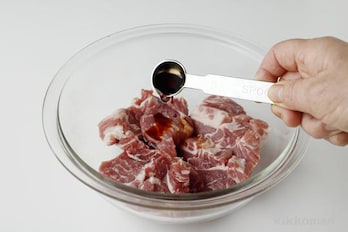 豚肉は約1cm厚さに切ってから食べやすい大きさに切り、ボウルに入れる。(A)のしょうゆ、塩、こしょうをもみ込み、さらにパプリカパウダー、水を加えてよくもみ混ぜ、30分~半日ほどおく(豚肉は脂身の少ないものがおすすめ)。【しょうゆポイント】豚肉の下味にしょうゆをもみ込むと、肉の中までうまみがしみ込みます。