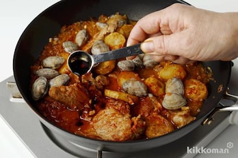 ふたを取ってあさりと(3)のじゃがいもを加えて混ぜ、しょうゆと好みでカイエンペッパーを加えてさっと混ぜ、再びふたをして5分ほど蒸し煮にする。【しょうゆポイント】味つけにしょうゆを加えることで、まろやかな塩けがつき、うまみが広がります。