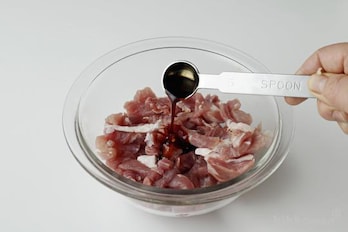 玉ねぎはみじん切りにする。マッシュルームは5㎜厚さの薄切りにする。豚肉は1cm厚さの薄切りにしてから棒状に切り、(A)のしょうゆをもみ込み、塩、こしょうをまぶす。【しょうゆポイント】豚肉の下味にしょうゆを使うことで、ほどよい塩けとうまみがなじみます。