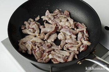 フライパンに油を中火で熱し、豚肉を炒める。表面が白っぽくなったらいったん取り出す(火を通しすぎないのがコツ)。