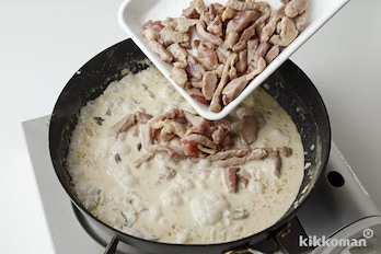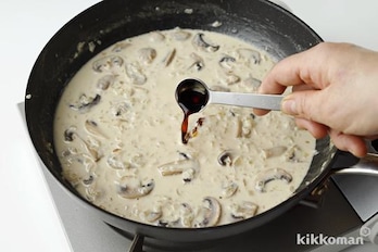 白ワインを加えて煮詰め、半量程度になったら、(B)を順に加えて煮立たせる。【しょうゆポイント】しょうゆを加えると、生クリームと牛乳のコクにうまみが加わります。