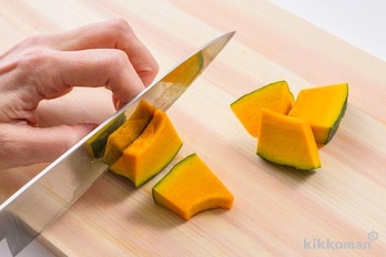 かぼちゃは種とわたを取って、縦に3cm幅に切り、横に1cm幅に切る。玉ねぎは繊維に沿って薄切りにする。