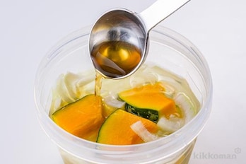 耐熱性の器にかぼちゃ、玉ねぎを入れ、水150ml、白だしを加える。ふんわりとラップをして、電子レンジ(600W)で3分30秒~4分加熱する。