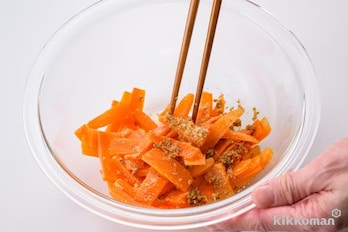にんじんは皮をむき、4cm長さに切り、縦に1.5cm幅に切ってから、薄切りにする(短冊切り)。耐熱容器に入れてふんわりとラップをかけ、電子レンジ(600W)で3分加熱する。