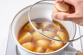 水200ml、本つゆを加え、ひと煮立ちさせる。ふたをして、弱火で10〜12分煮る(途中で一度、煮くずれしないように、やさしく上下を返す)。