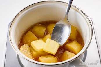 じゃがいもに竹串がスッと通るくらいまで煮て、火を止める。バターを加え、余熱で溶かしながら全体にからめる。