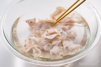 鍋に湯を沸かし、弱火にしてから豚肉を広げ入れる。色が変わったら冷水に取り、水けをしっかりきる。
