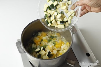 鍋にオリーブオイル、にんにくを入れて中火にかけ、香りが立ったら玉ねぎ、セロリ、ピーマン、パプリカを加え、しんなりするまで7~8分炒める。ズッキーニを加えてさっと炒め合わせ、砂糖を加えてさっと混ぜる。