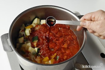 白ワインビネガーを加え、ひと煮立ちしたらカットトマト、塩、しょうゆ、ローリエを加え、7~8分煮て火を止める。【しょうゆポイント】しょうゆを加えると、トマトのうまみ成分との相乗効果でさらにうまみが増します。
