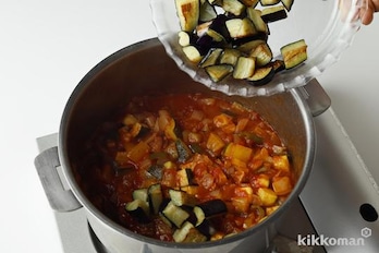 (4)のなすを(3)に加え、強めの中火にかける。ときどき混ぜながら2分ほど煮て軽く水けをとばす。