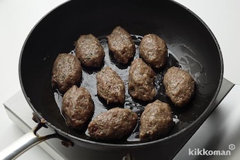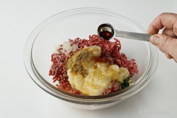 ボウルにひき肉、(1)の玉ねぎ、(A)を入れ、粘りが出るまでしっかり練り混ぜる。10等分に分け、楕円形に成形する。【しょうゆポイント】肉だねの味つけにしょうゆを使うと、肉汁のうまみがさらに際立ちます。