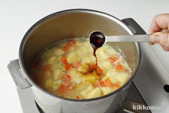 (A)を加えて再び煮立ったら弱火にし、ふたをして野菜に火が通るまで10分ほど煮る。【しょうゆポイント】スープの味つけにしょうゆを加えることで、ほどよい塩けとうまみが加わります。