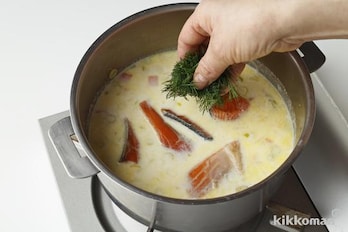 牛乳を加え、ふつふつとしてきたら(1)の鮭とディルを加え、鮭に火が通るまで2~3分煮る。(B)で味を調える。