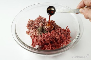 ボウルにひき肉、(A)を入れてよく練り混ぜ、冷やご飯、玉ねぎ、レーズンを加えてさらに練り混ぜる。【しょうゆポイント】味つけにしょうゆを加え、うまみのある肉だねにします。