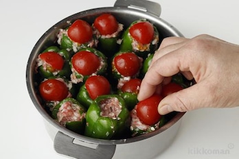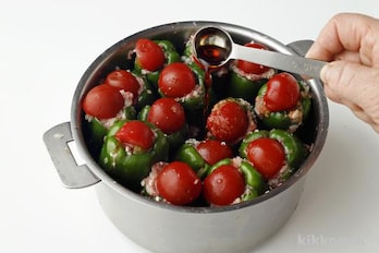 (1)のピーマンに(3)の肉だねをしっかり詰める。直径約20cmの鍋に立てて並べ、切り口にミニトマトをのせる。