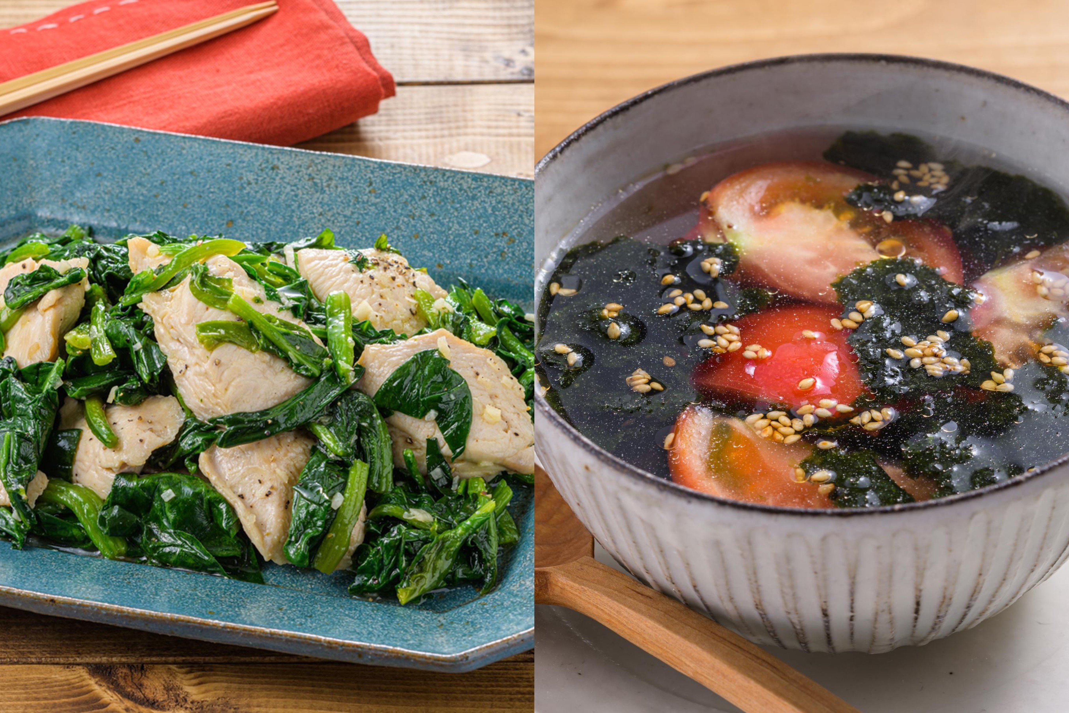 鶏肉とほうれん草の白だし炒め&のりとトマトのスープ(2.2g)