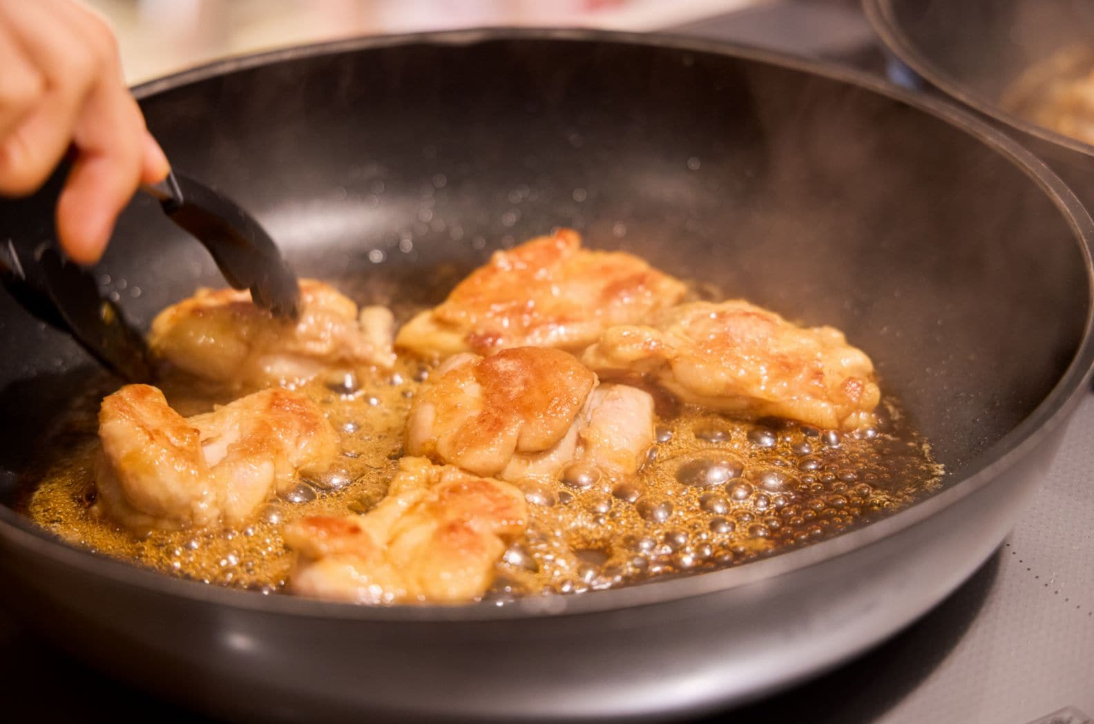 鶏肉にしょうゆをもみ込み、うまみと下味をつけておくと出来上がりがひと味違います。小麦粉を薄くまぶすのもお忘れなく。肉がジューシーに焼け、タレもよくからみます。焼くときは、先に身側を少し焼いてから皮目を焼くと肉が縮みにくくなります。また、皮目を焼き始めたら動かさないこと。香ばしく焼き上げるコツです!