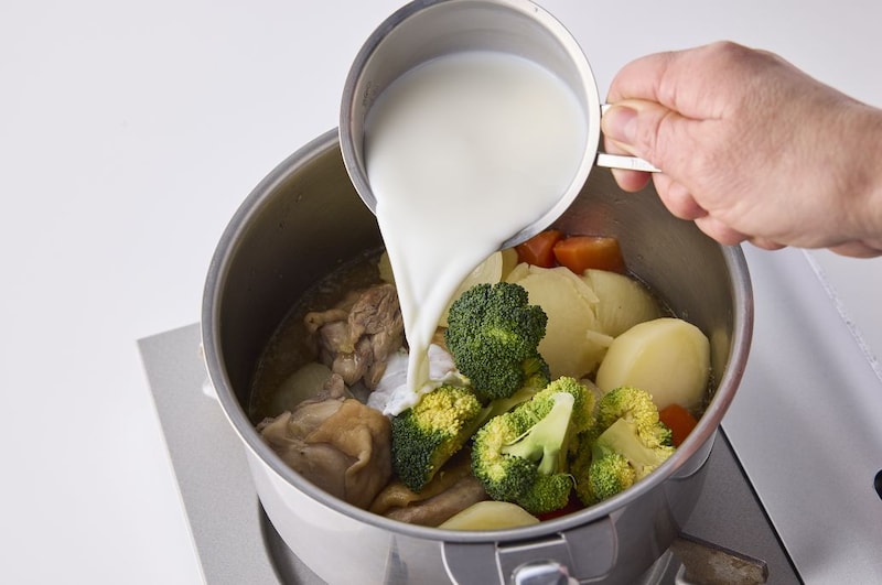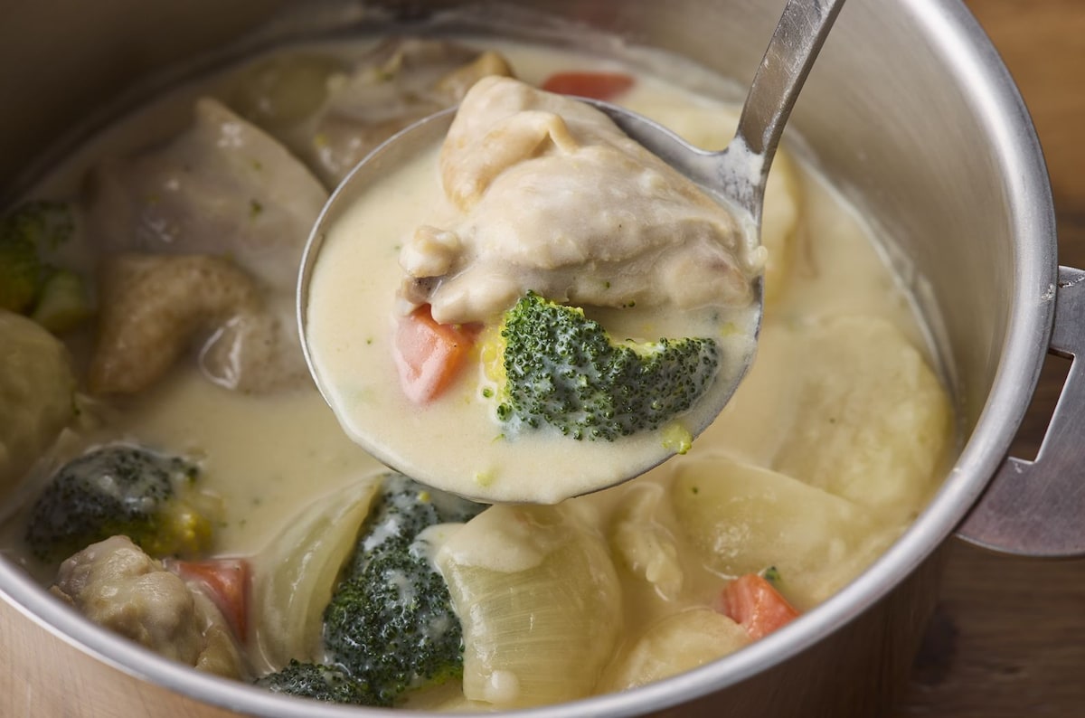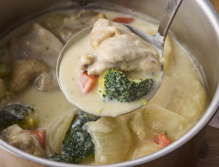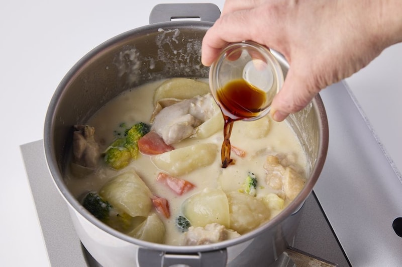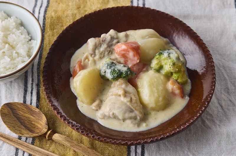 クリーム煮はご飯に合わない? いえいえ、しょうゆを効かせれば相性抜群になるんです! 鶏肉の下味にしょうゆを使うことでうまみがギュッと引き立ち、こく深い味わいに。しかも、しょうゆの色もほんのりついて、むしろ食欲をそそる絶妙な仕上がりになります。野菜もごろごろ入っているから、ご飯にかけるだけで栄養バランスもバッチリなワンプレートになりますよ。