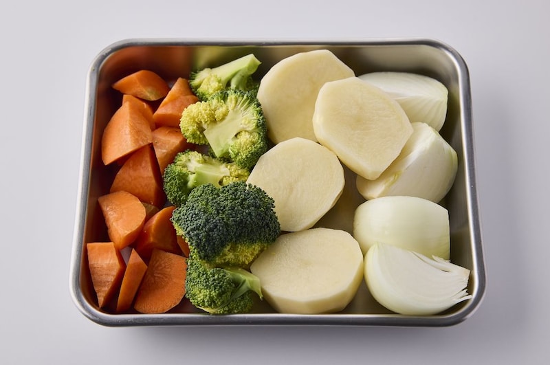玉ねぎは縦4等分に切る。にんじんは皮をむき、小さめの乱切りにする。じゃがいもは皮をむき、半分に切る。ブロッコリーは房が大きければ半分に切る。