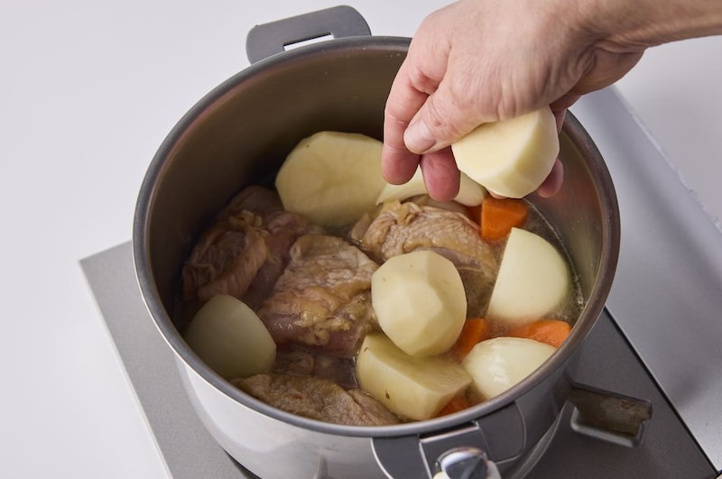 - (3)で具材を煮る際は、鍋にサラダ油を入れて中火にかけ、豚肉、玉ねぎ、にんじんを加えて炒める。油が回ったら水を加え、煮立ったら弱めの中火にし、ふたをして5分ほど煮る。じゃがいもを加え、再び煮立ったら7分ほど煮る。