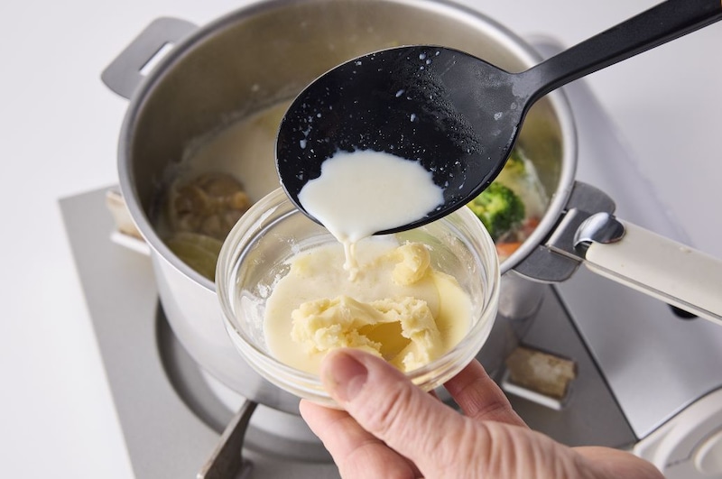 ブロッコリー、牛乳を加え、ひと煮立ちさせて火を止める。小さめの器に(B)のバターを入れてゴムべらで練り、小麦粉を加えてペースト状になるまで練り混ぜておく(これが煮込み料理やシチューにとろみをつけるときに使われる「ブールマニエ」)。