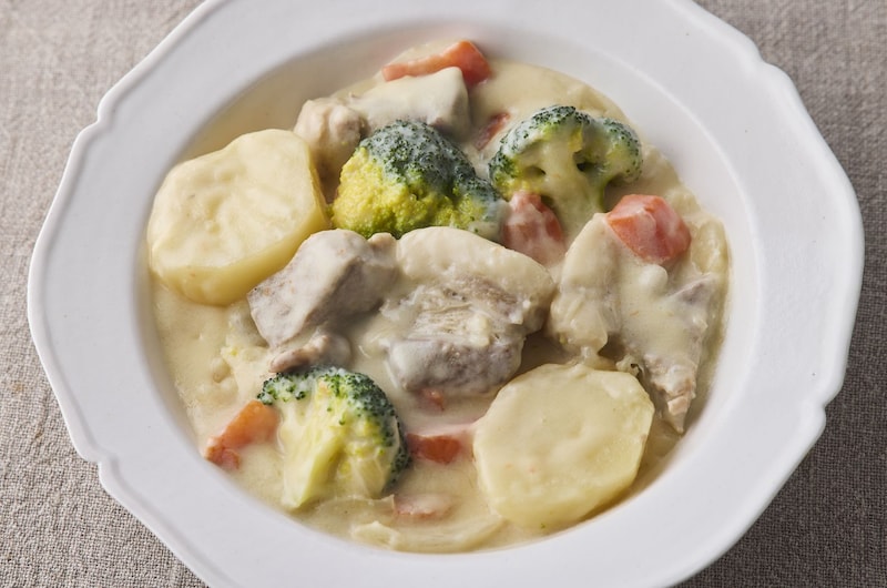 鶏肉を豚肩ロース肉にチェンジ! チキンのしょうゆクリーム煮とまったく同じ配合&手順でつくれるから、その日の気分で肉を選んで楽しみましょう。肉の種類が違うと、味わいがガラッと変わるのが注目のポイント。ただし、豚肉は鶏肉より火が通りにくいので、じゃがいもを加える前に5分ほど煮るのがコツです。