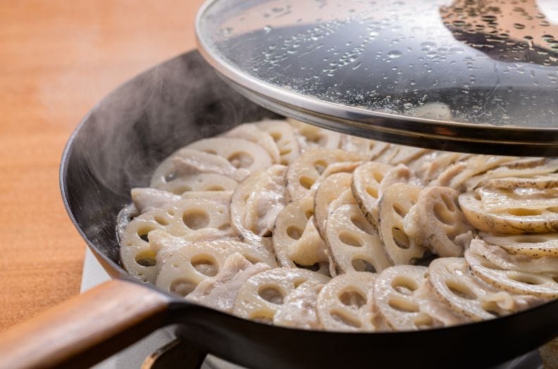 同心円状に並べてフライパンの全面に広げることで、根菜のれんこんでも短時間で火が通りやすく、加熱むらも少なくなります。