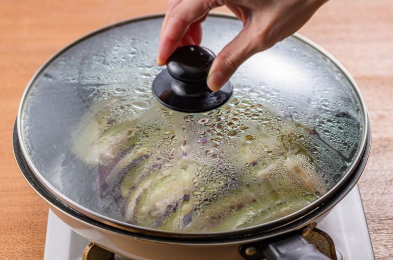 ふたをして加熱することで、全体に蒸気がゆきわたり、食材に均一に熱が入ります。生焼けの心配もなくばっちり味が決まります。