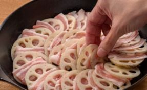 れんこんは輪切り、豚バラ肉はキッチンばさみでざっくりカット、あとは無心に素材を重ねていくだけというお手軽さがうれしい一品です。肉汁を逃さないためにもフライパンごと出すのがおすすめ。れんこんの穴に適度にねぎだれが絡んで、具材とたれの一体感もバツグンです!