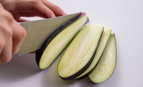なすは縦に切ると実の部分の面積が広くなるので、火の通りが早く、味もしみやすくなります。輪切りの時よりも枚数が少ないのでスピーディーに並べられるのもポイント。
