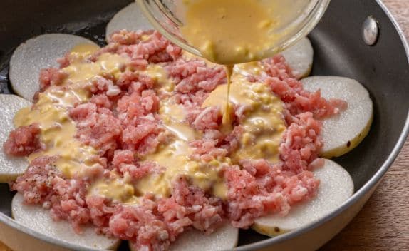 - フライパンに油を入れ 、長芋をなるべく重ならないように入れ、その上にひき肉を平らに広げる。
