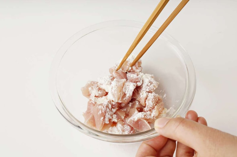 鶏肉に小麦粉をまぶす