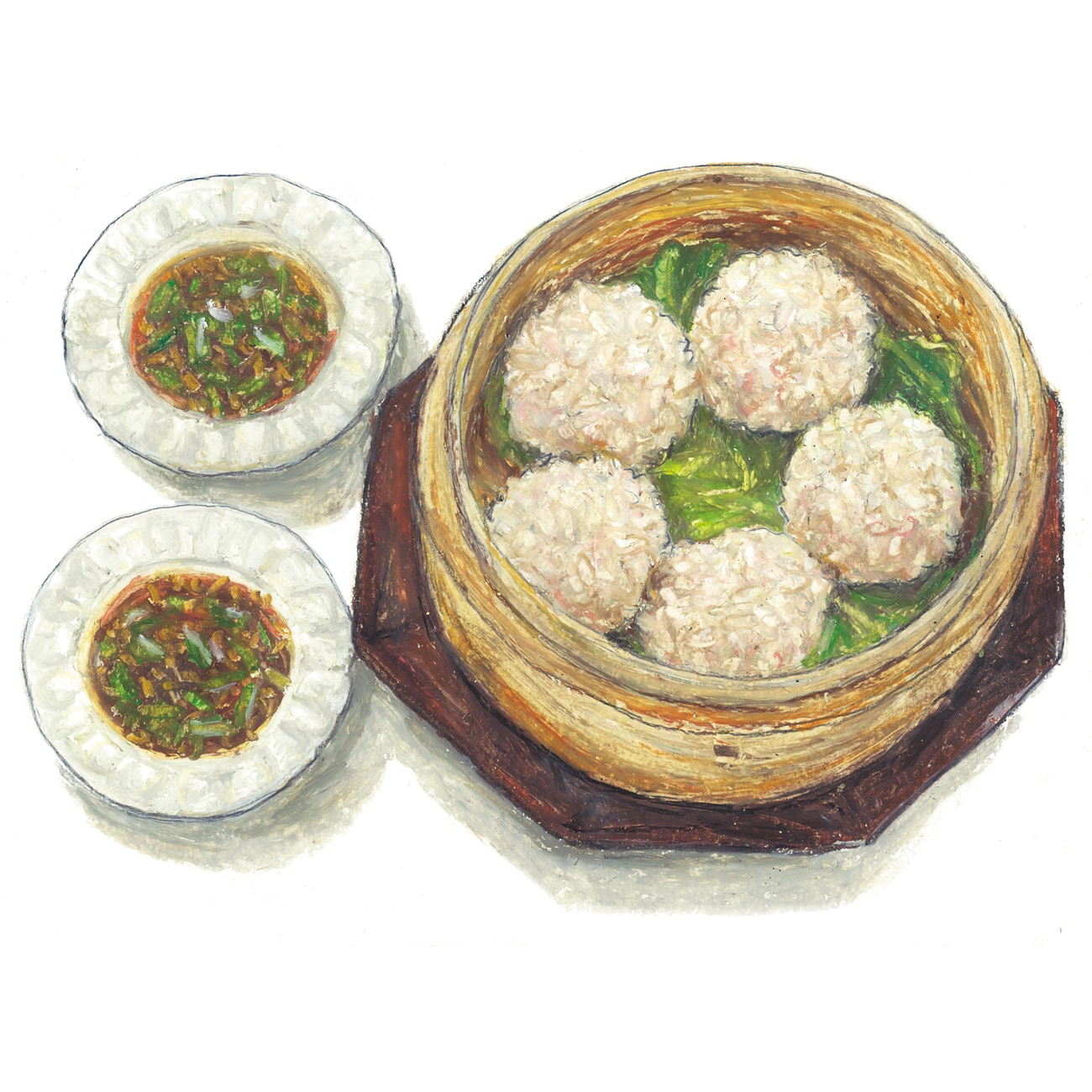 湯気の向こうに、ふっくらと透き通るもち米焼売。