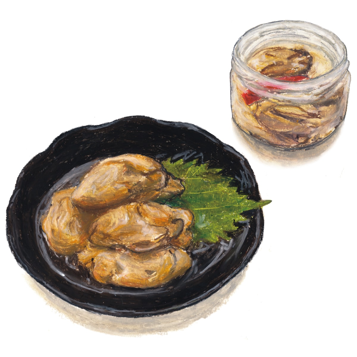 - 保存容器に漬け込み用の油とにんにく、赤唐辛子を入れ、粗熱をとった牡蠣を入れて漬け込む。