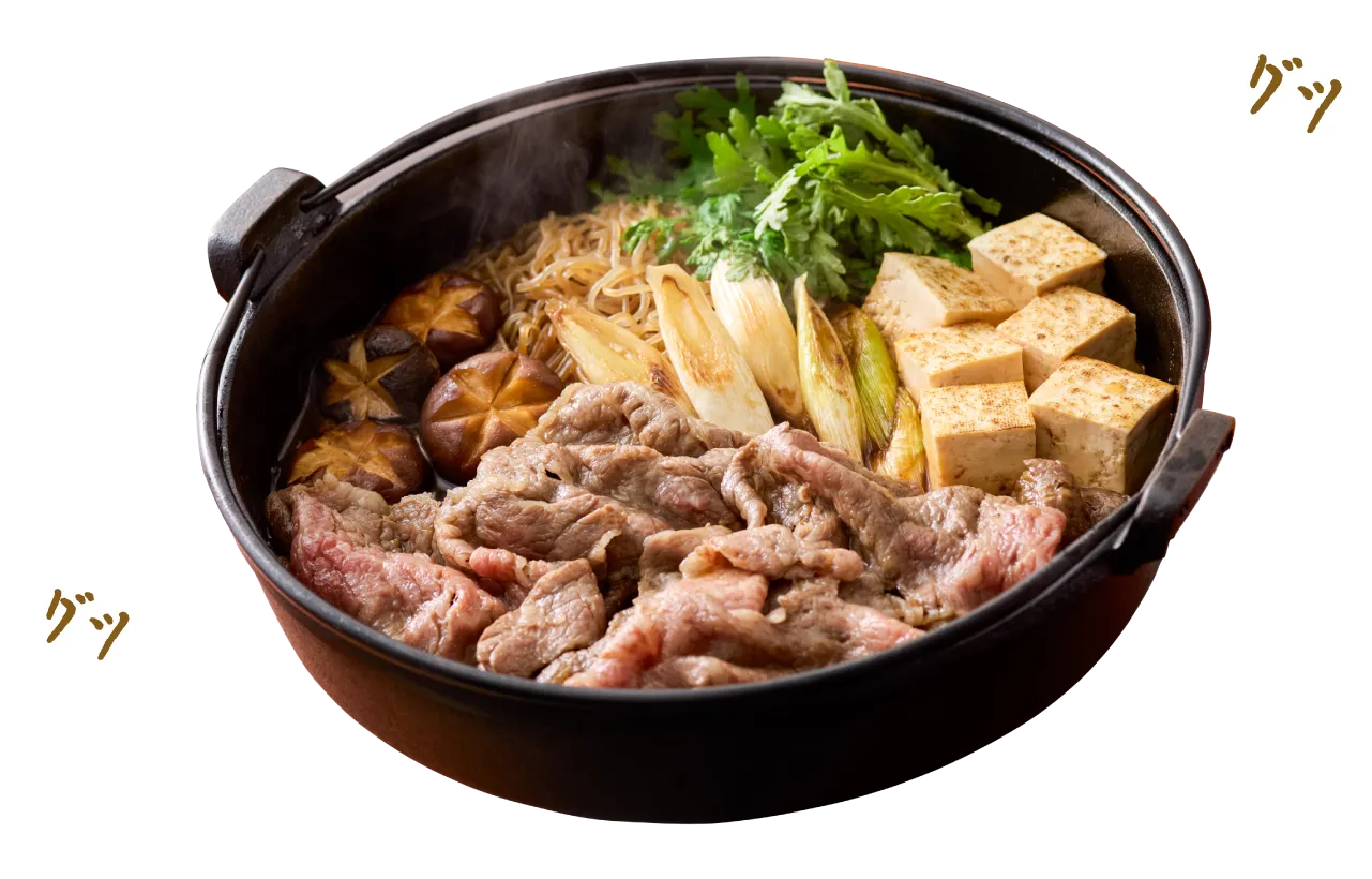 関西風スタイルをキッコーマン流にアレンジ。最初に牛肉を焼いて、しょうゆと砂糖を絡めるようにして焼くのが特徴。そのあとで、調味料を加えて食材の水分も活用しながらグツグツと火を入れて楽しみます。